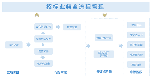 包含招标、投标、开标、评标、定标管理等,实现在线全流程管理操作